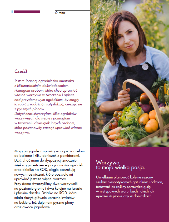 W tym ebooku dzielę się sprawdzonymi rozwiązaniami, które naprawdę działają – bez zbędnej teorii i bez ogrodniczego żargonu kilkunastoletnim doświadczeniem w uprawie warzyw. Założyłam kilka warzywników w różnych formach dla siebie i pomogłam wielu osobom stworzyć ich własne ogródki, dzięki temu wiem, co jest naprawdę ważne w tym procesie, a co spokojnie można odpuścić.